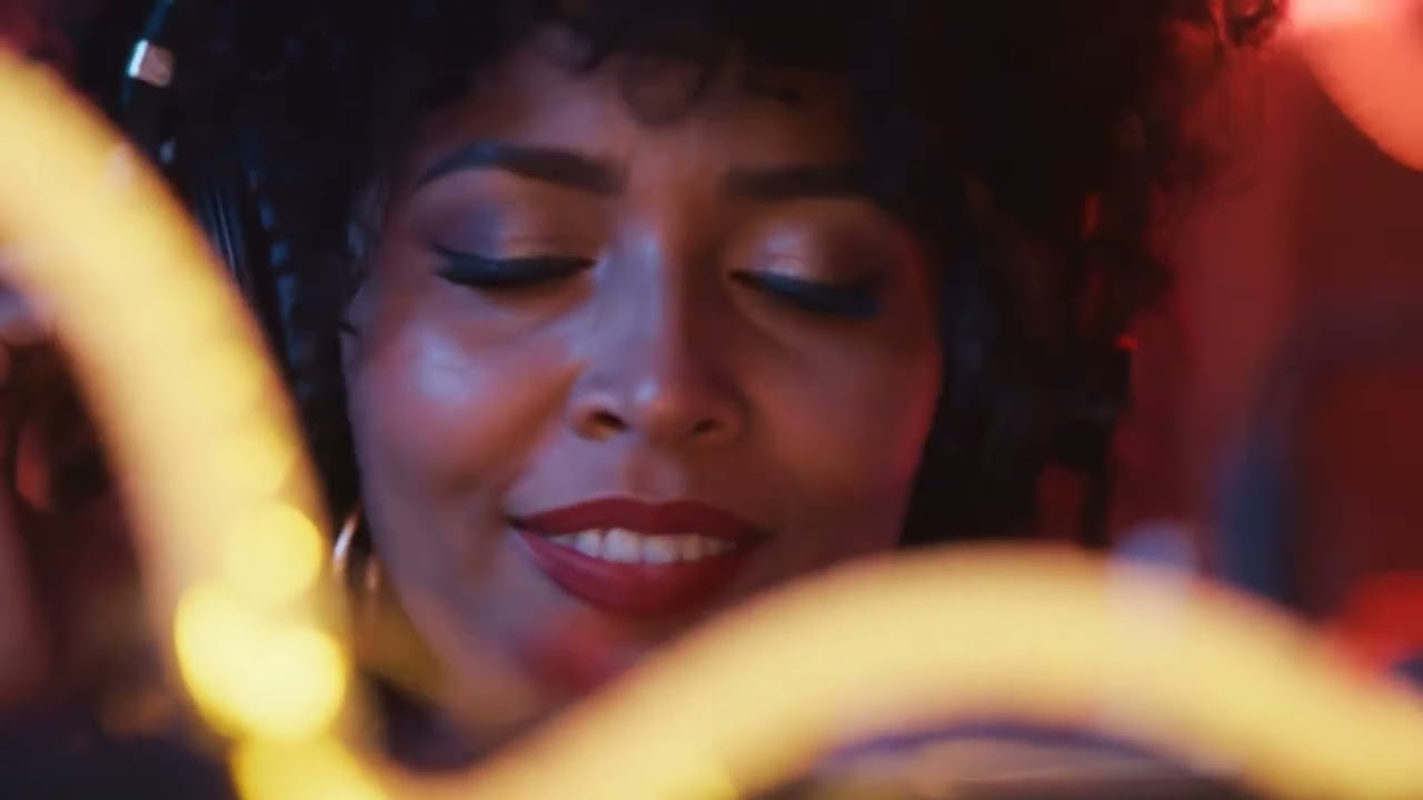 Prompt: An extreme close-up shot focuses on the face of a female DJ, her beautiful, voluminous black curly hair framing her features as she becomes completely absorbed in the music. Her eyes are closed, lost in the rhythm, and a slight smile plays on her lips. The camera captures the subtle movements of her head as she nods and sways to the beat, her body instinctively responding to the music pulsating through her headphones and out into the crowd. The shallow depth of field blurs the background. She’s surrounded by vibrant neon colors. The close-up emphasizes her captivating presence and the power of music to transport and transcend.